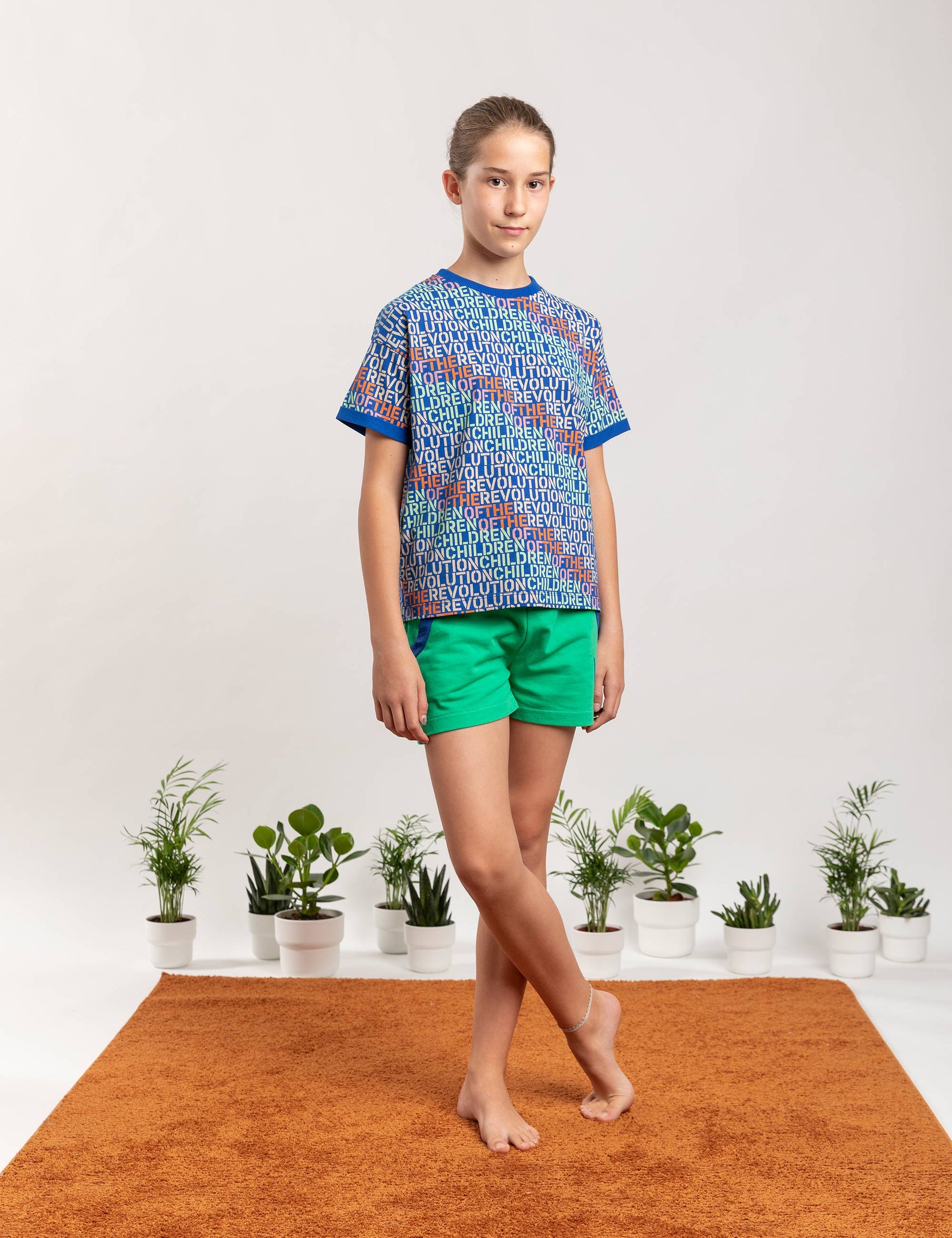 Short-sleeved printed tee with a fixed cuff, dropped shoulders, and a crew neckline. Side positional graphic and a longer curved back.