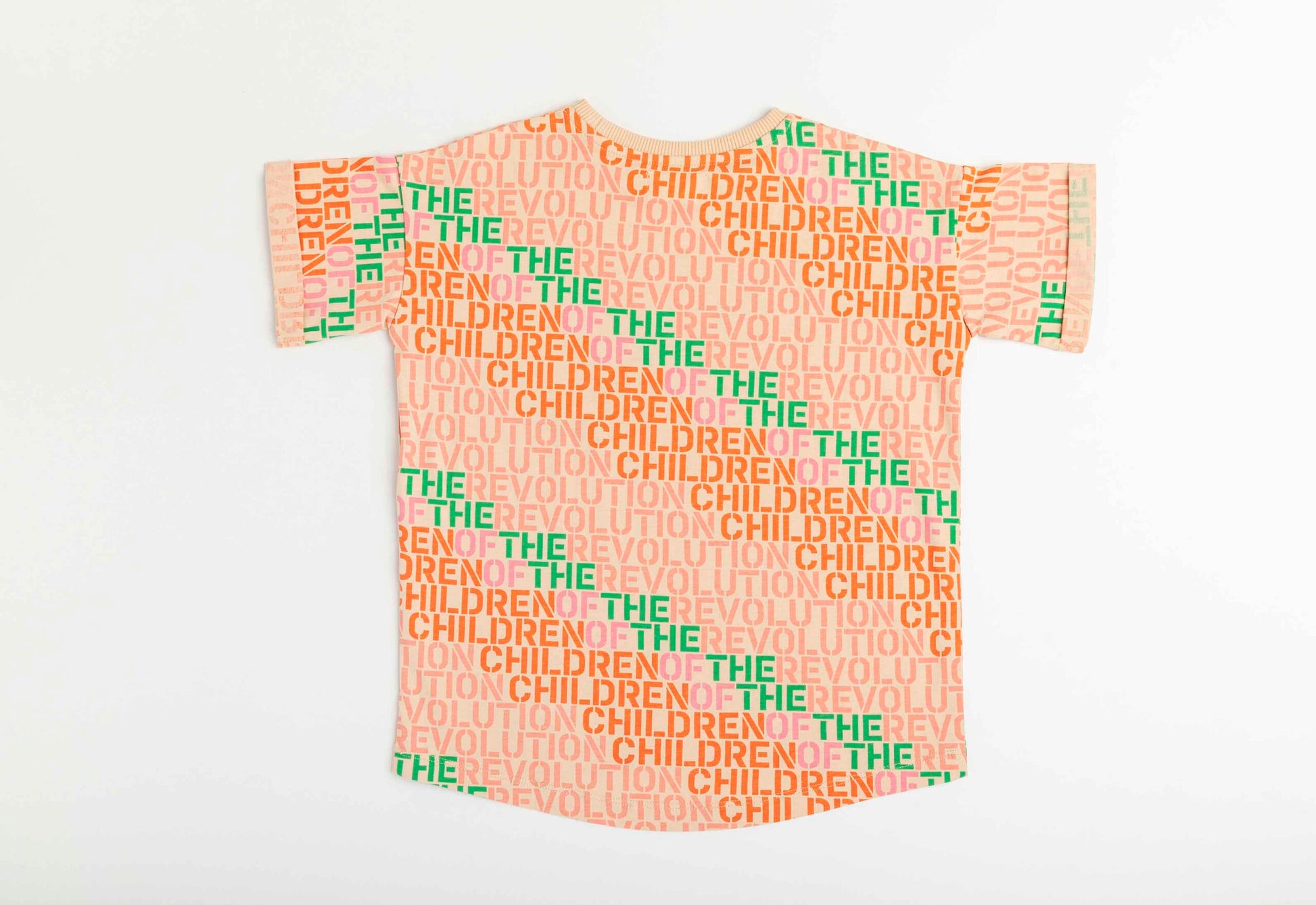 Short-sleeved printed tee with a fixed cuff, dropped shoulders, and a crew neckline. Side positional graphic and a longer curved back.