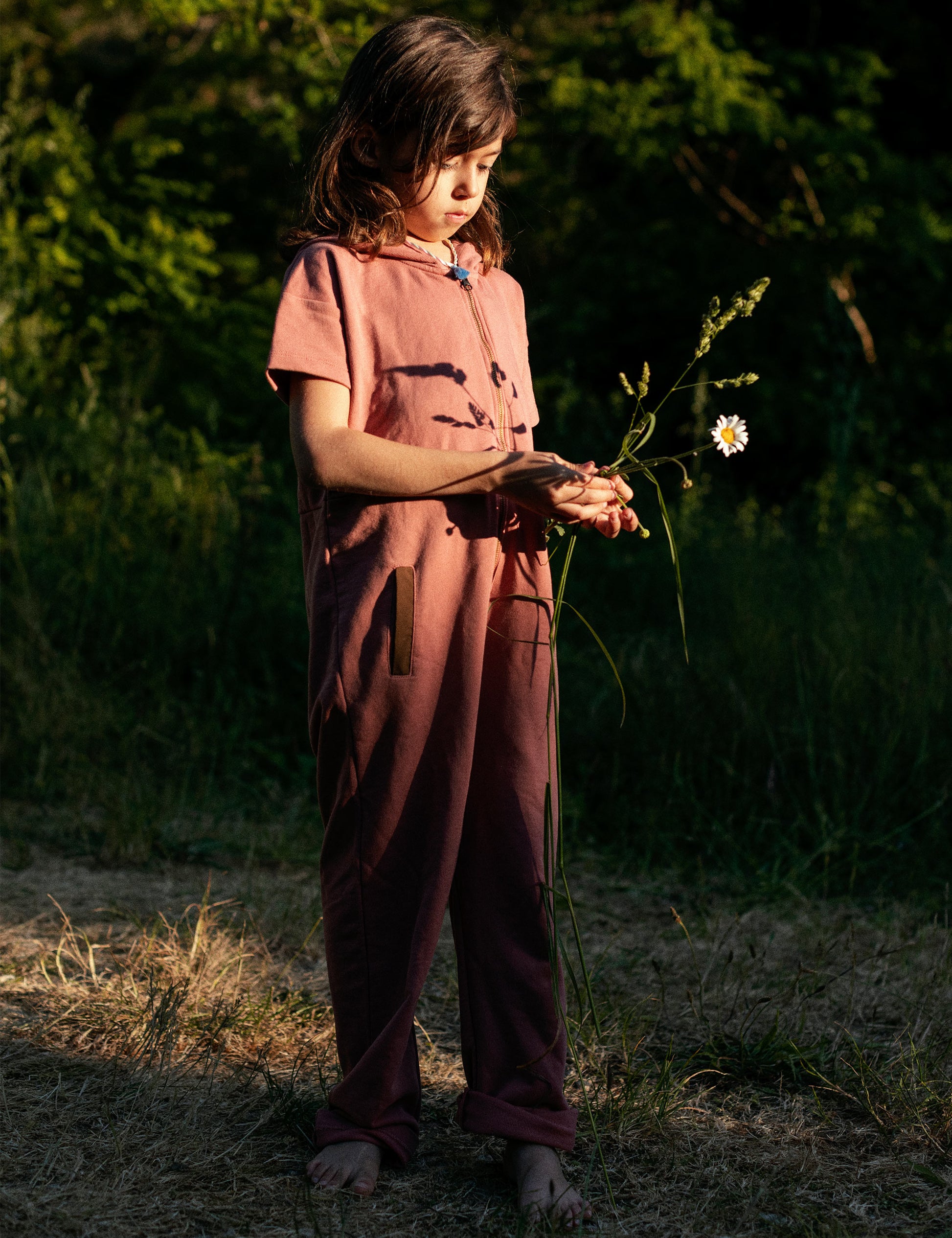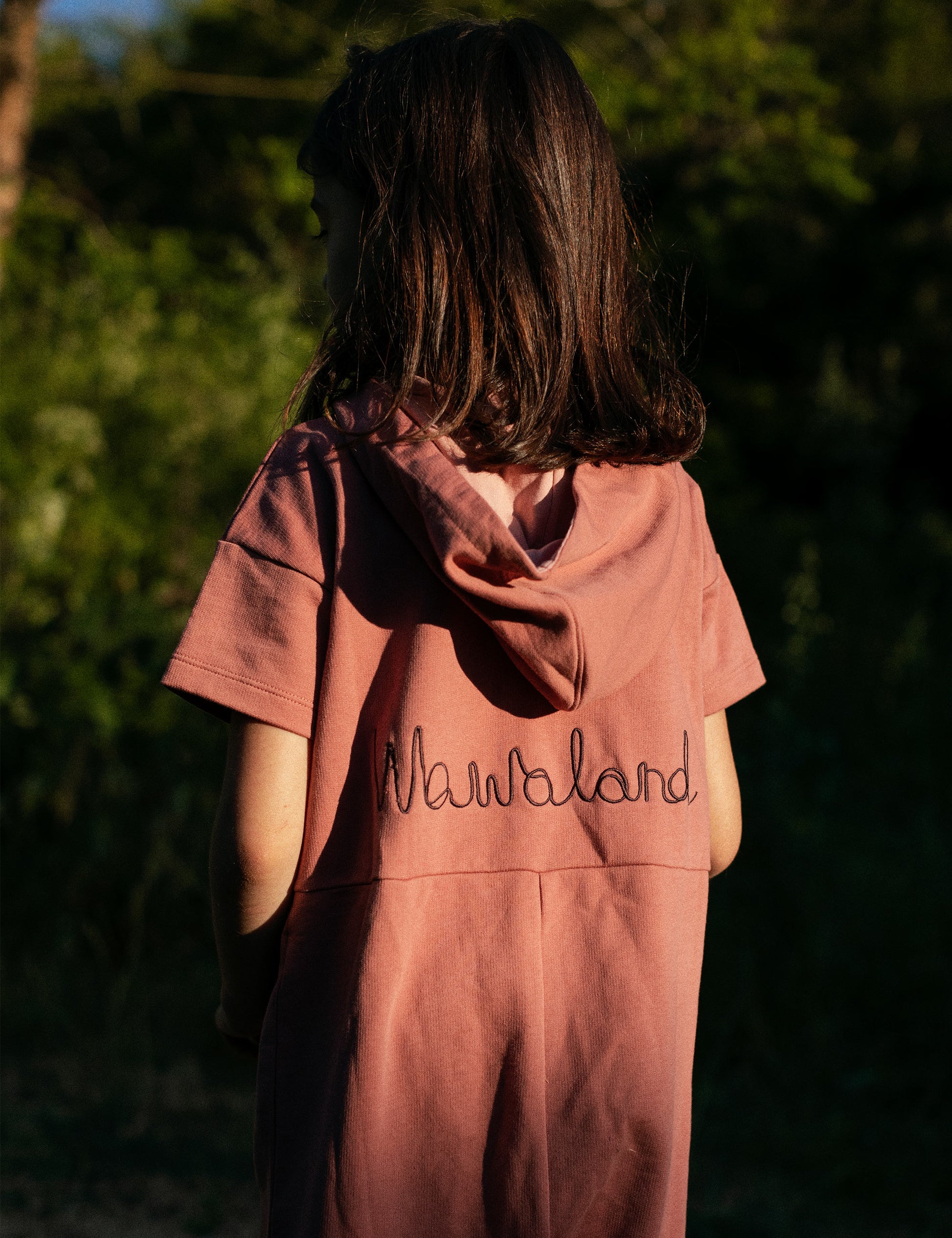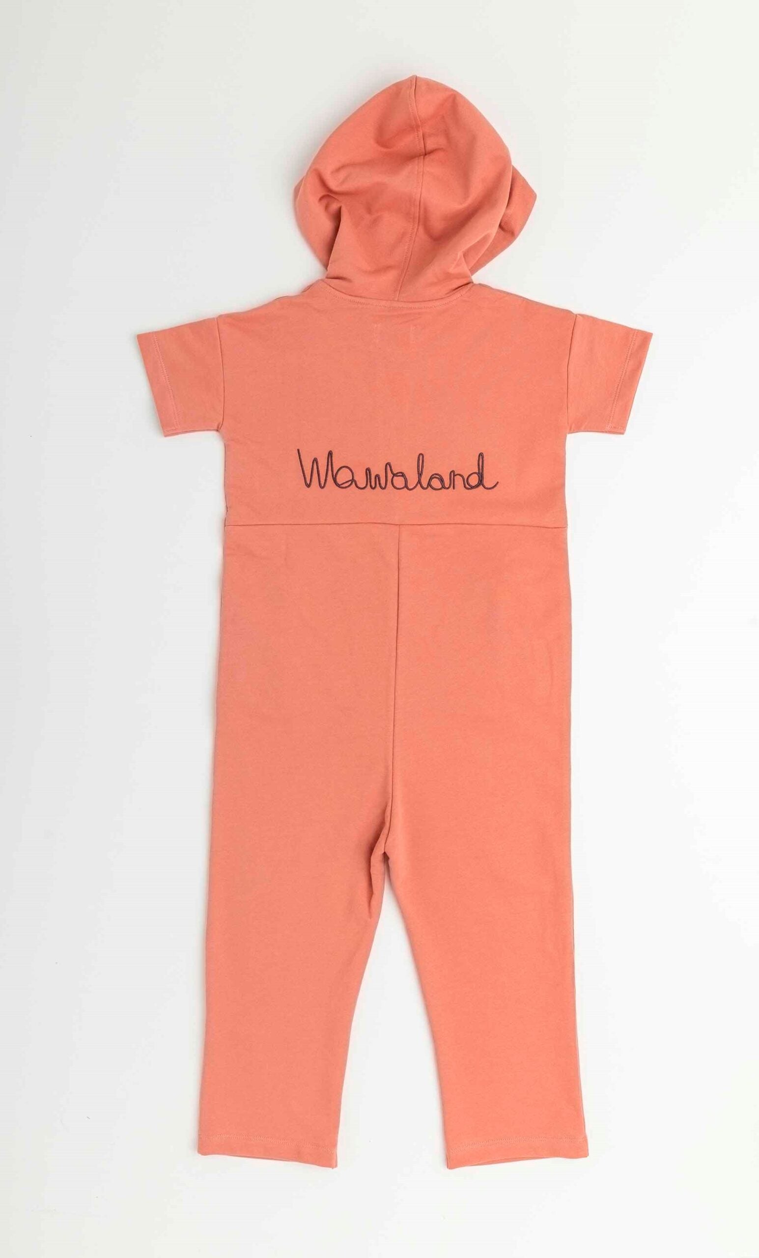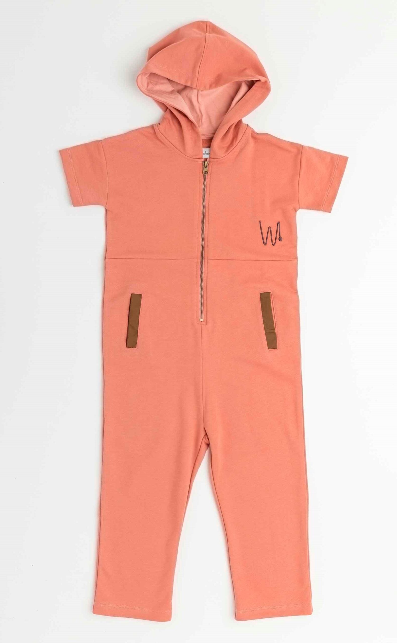 Short-sleeved hooded jumpsuit with a center zipper and contrasting embroidery on the front and center back. Flat panel detailing on the front side pockets.