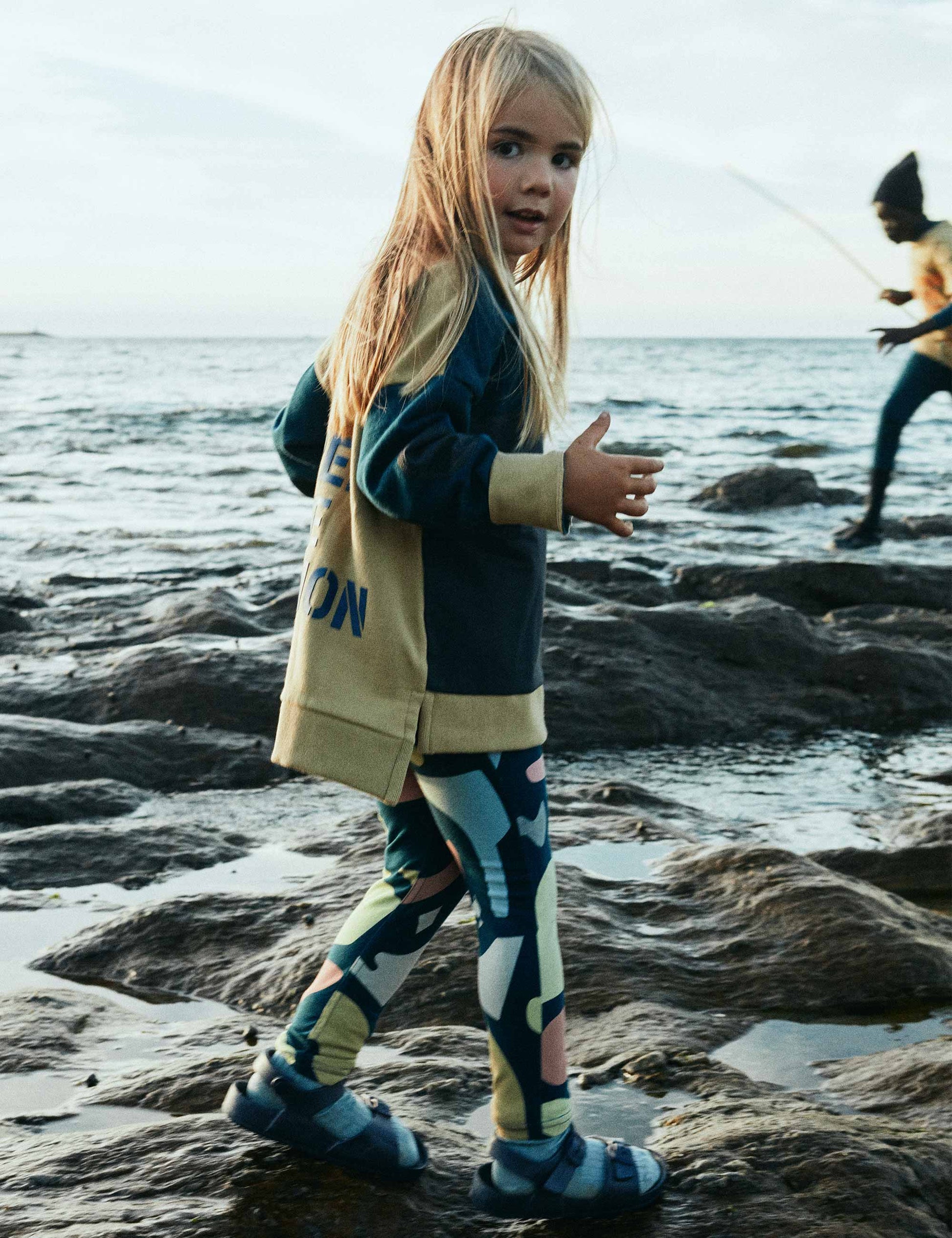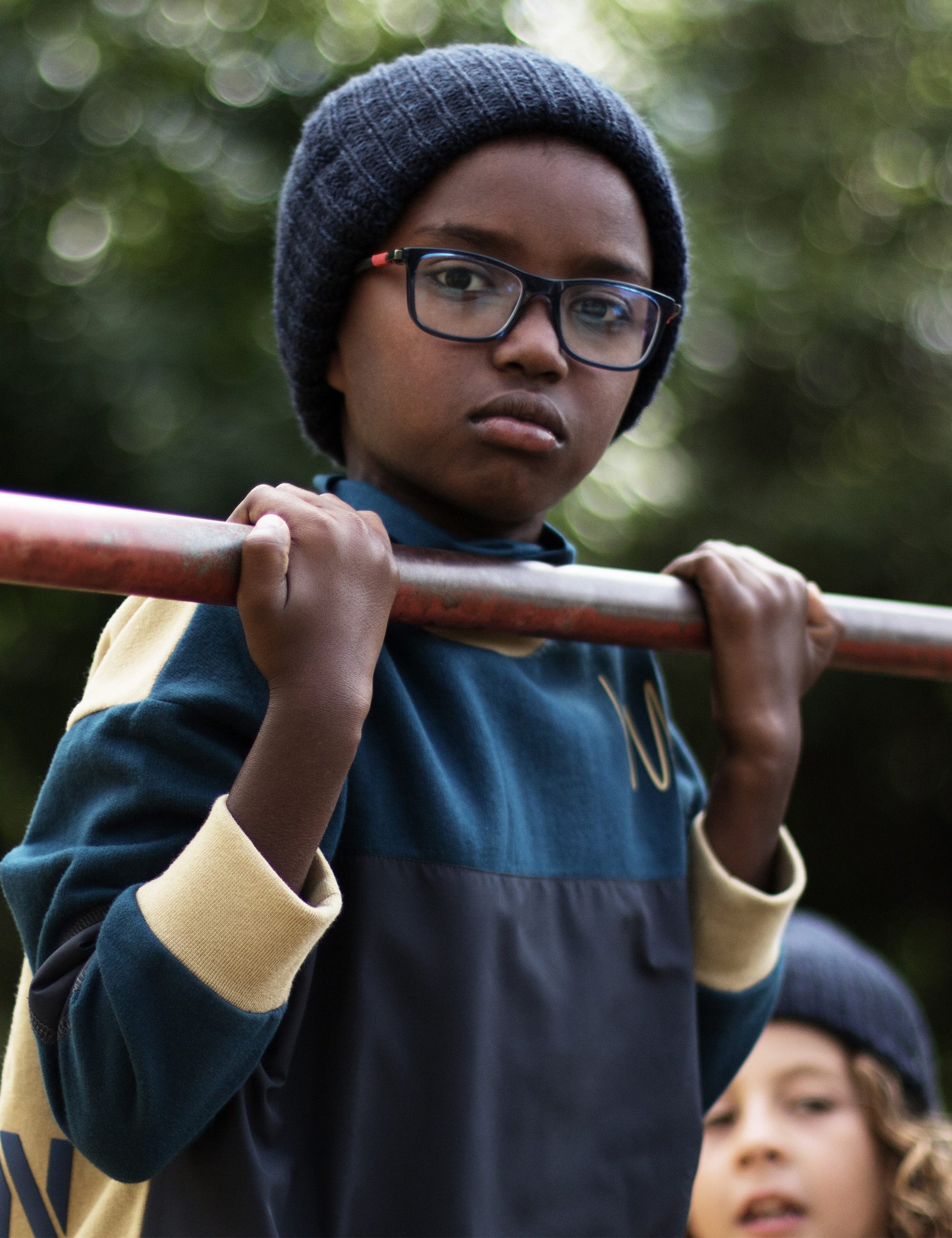 Long-sleeved crew-neck sweatshirt with contrasting plain fabric on the front and elbow patches. Printed on the front and center back.