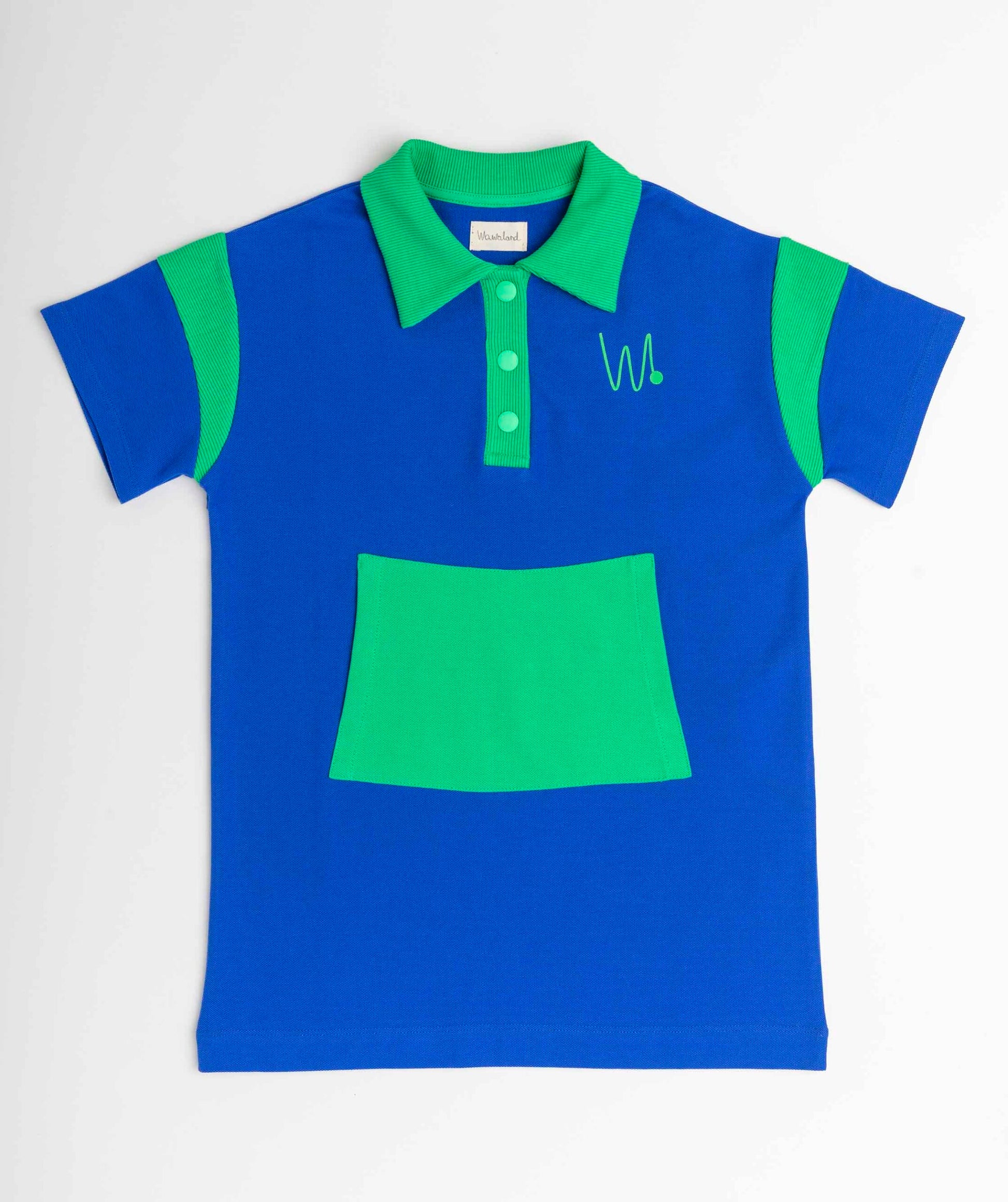 Short-sleeved midi polo dress with a collar, center placket, kangaroo pocket, and contrasting armholes. Positional graphic on the front.